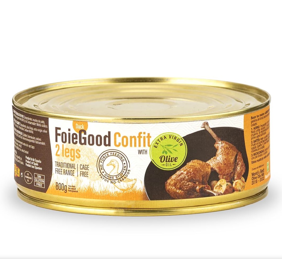 Konfiterade anklår som långsamt har tillagats i olivolja. Här vi det absolut möraste och ljuvligaste köttet från icke tvångsmatade ankor. Servera dem till rostad potatis, svamp, mos, en god sås… Tillagning: Separera anklåren från olivoljan och gelatinet (detta kan du använda som bas i din sås), rosta låren på bakplåtspapper i ugn på 200°C i 12 minuter, skinnsidan ska vara upp. Det går även bra att steka dem i stekpanna, ha då skinnsidan neråt. Addera inget salt, de är redan kryddade. Efter öppnande av burken, använd dem inom fem dagar. Detta är ett fantastiskt alternativ! Ankorna lever utomhus, burar används aldrig, de växer långsamt, har tillgång till vatten att simma i och får 100% naturlig, vegetabilisk mat. Och kanske det viktigaste: de har inte har blivit tvångsmatade.