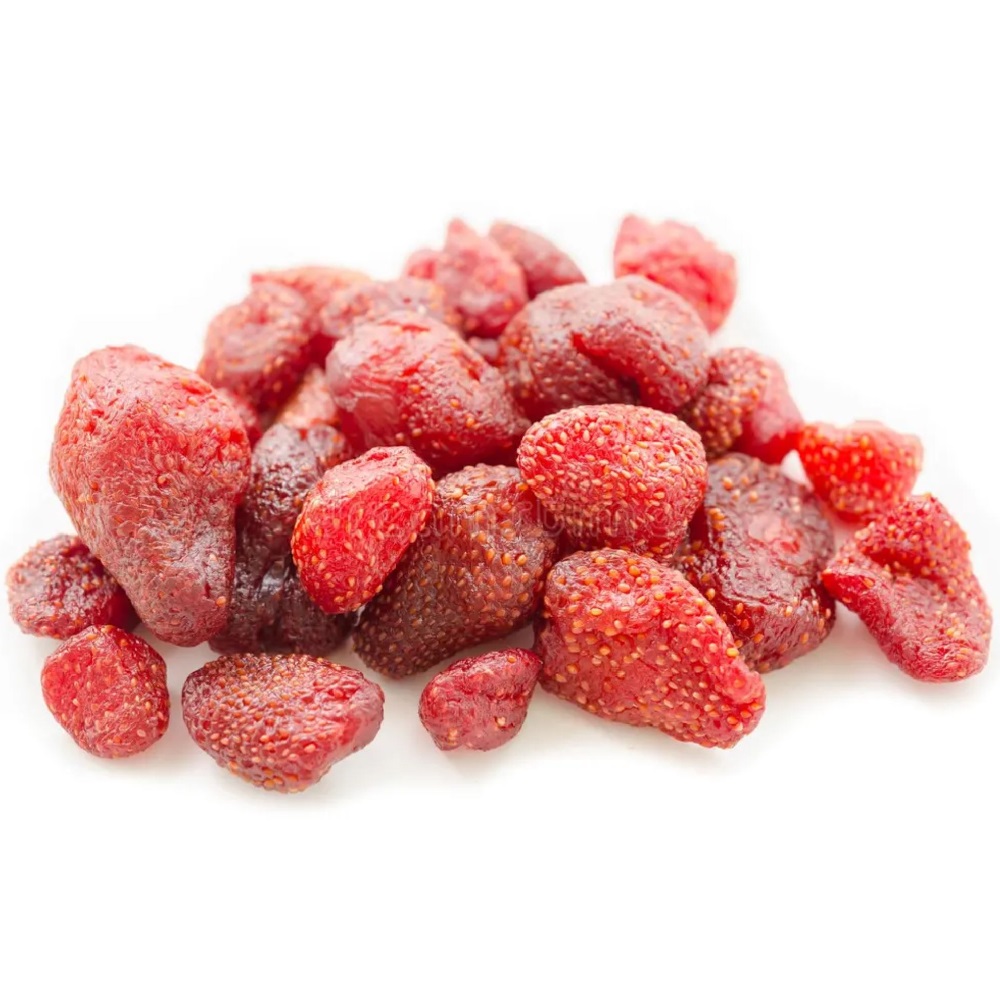 Lätt-torkade jordgubbar med en underbart söt smak och mjuk, lite seg, konsistens. De kokas med socker för att därefter torkas i ugn. Goda som snacks eller till gräddiga ostar som Délice de Bourgogne. Jordgubbarna är AZO-fria.