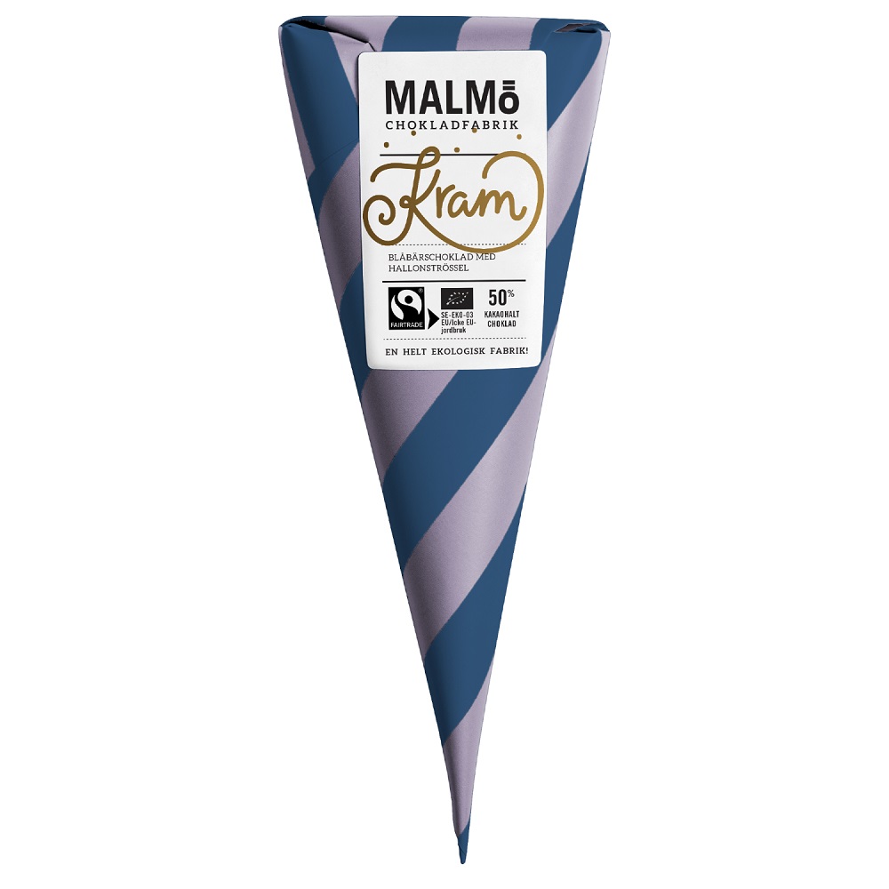 En kram frigör endorfiner i kroppen. Precis som choklad. Prova vår kramgoa mörka  choklad med somriga hallon och blåbär. Chokladen är ekologisk och fairtrade, samt fri från nötter, soja och är glutenfri. På Malmö Chokladfabrik skapas choklad med äkta kärlek och sprudlande entusiasm. All choklad är 100% ekologisk, onödiga tillsatser lyser med sin frånvaro.