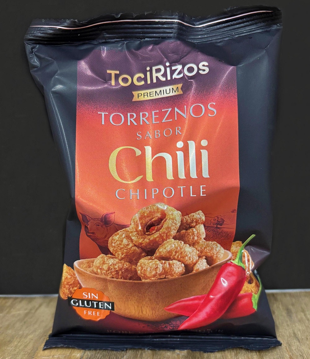 Krispiga, knapriga munsbitar av fläsksvålar som är friterade i sitt eget fett, med smak av ibéricoskinka och kryddade med chipotle.